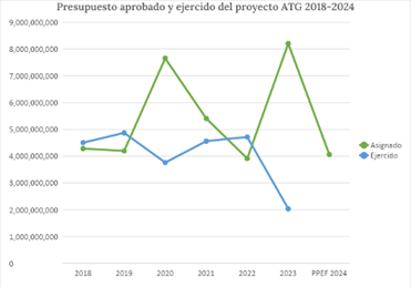 6. En 2018, se asignaron 4 283 millones de pesos, de los cuales se sobre-ejerció 5%. Para 2019, se asignaron 4 196 millones, y se registró una sobre-ejecución de 16%. En 2020, el presupuesto asignado aumentó 83%, llegando a 7 660 millones de pesos, de los cuales se ejerció casi la mitad, es decir, el 49%. Empero, en 2021, el presupuesto se recortó 30%, quedando asignados 5 409 millones de pesos, de los cuales se ejecutó 84%. En 2022 nuevamente se redujo el presupuesto, esta vez en 28%, asignándose 3 912 millones de pesos, con un sobre-ejercicio de 21%. Para 2023, se destinaron 8 208 millones de pesos, de los cuales se ha ejecutado 25% hasta el segundo trimestre de este año.