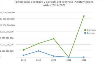 En el año 2018, se asignaron 6,575 millones de pesos para dos proyectos que requieren el uso de fracking: Aceite Terciario del Golfo (ATG) y Aceite y Gas en Lutitas (dato crucial 2). En promedio, se utilizó 55% de los recursos asignados a proyectos que involucran la fracturación hidráulica (dato crucial 3). Para el proyecto Aceite Terciario del Golfo, se gastaron más recursos de los asignados, mientras que para el proyecto Aceite y Gas en Lutitas, se gastaron menos recursos en todos los años, con excepción del 2021.