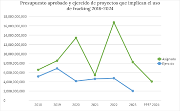 Con la llegada del presidente Andrés Manuel López Obrador al poder, se continuaron asignando recursos para proyectos que implican el uso de la fracturación hidráulica, comúnmente conocida como fracking, lo cual va en contra de la narrativa establecida con “los cien compromisos del gobierno” (dato crucial 1). A pesar de este compromiso, durante el periodo presidencial, que abarca desde 2018 hasta 2024, se han mantenido las asignaciones presupuestales para estos proyectos, incluidos en el Proyecto del Presupuesto de la Federación 2024 (PPEF).