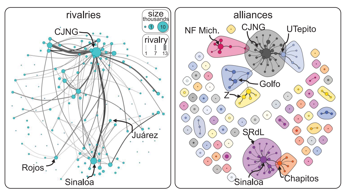 2. Para construir el modelo, se midieron datos sobre 150 cárteles activos en México en 2020, incluyendo información sobre sus alianzas y rivalidades y datos correspondientes a homicidios, personas desaparecidas y encarcelamientos.