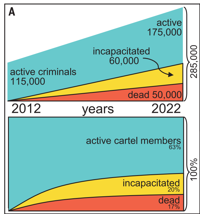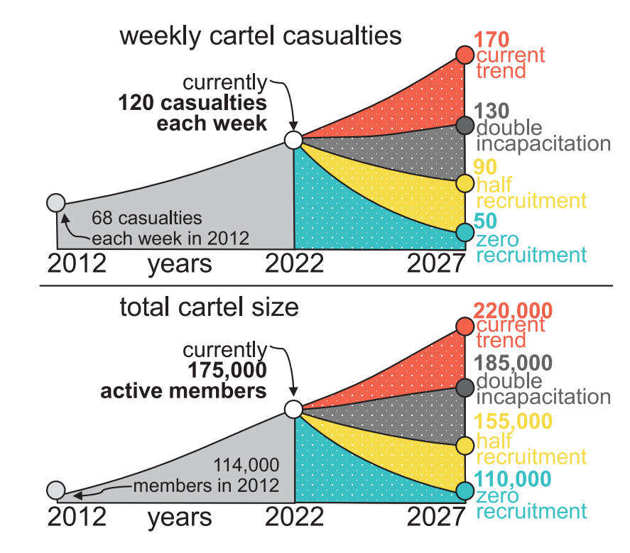 No todas las muertes, personas desaparecidas e incapacitaciones dentro del país son a causadas por miembros del cártel, ni la mayoría de las incapacitaciones están relacionadas con el encarcelamiento de los miembros del cártel (dato crucial 8). En total, 50 mil víctimas y 55 mil incapacitaciones afectan directamente a miembros del cártel. Con base a estas cifras, se estima que en 2012 había 115 mil miembros de cárteles y que en 2022 el número aumentó a 175 mil.