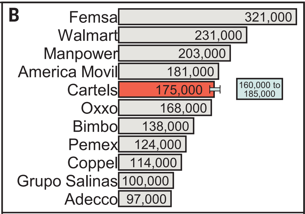 11. La Figura 3B representa el número de empleados de las 10 principales empresas en México y el tamaño de los carteles combinados. Se estima que los carteles tenían entre 160 mil y 185 mil miembros combinados