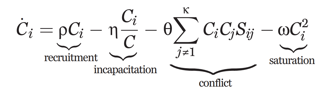 De acuerdo con los autores cuando se combinan las variables reclutamiento, encarcelamiento, conflicto y saturación, se obtiene la ecuación que calcula la tasa de cambio en el tamaño del cartel (Ci). En tal sentido, el parámetro Sij ≥ 0 captura la interacción entre carteles, mientras que las constantes (en letras griegras: rho, eta, theta y omega, respectivamente) representan los cuatro valores exógenos y endógenos descritos inicialmente.
