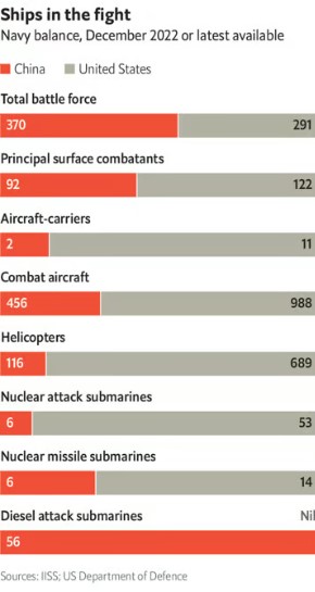 Para 2023, el presupuesto militar que destinará China será de 225 000 millones de dólares. Sin embargo, los beneficios en dicha rama podrían ser mayores porque el gasto no toma en cuenta las importaciones, bajos costos laborales y las acciones fuera del marco legal por parte de la defensa en el robo de tecnología militar a otros países. Además, la educación y el capital intelectual puede influir de manera importante porque a diferencia de los estadounidenses, hay más egresados en el nivel de doctorado en ramas de ciencias matemáticas y tecnología. Esto influye positivamente en la investigación y en el desarrollo de armamento, tales como armas hipersónicas y drones submarinos.