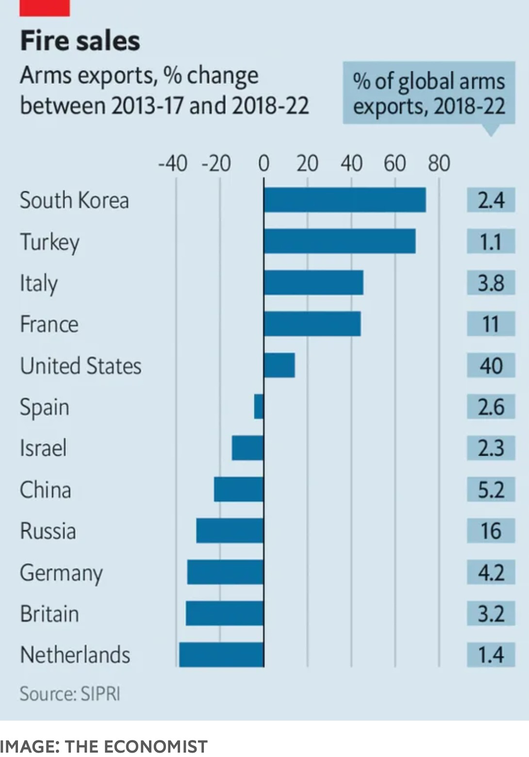 2. De acuerdo con información del Instituto Internacional de Investigación para la Paz de Estocolmo (SIPRI, por sus sigla en inglés), entre 2016 y 2022, Corea del Sur ascendió al noveno lugar en venta de armas, a nivel global. El gobierno surcoreano tiene planes para ascenderlo al cuarto lugar, en 2027.