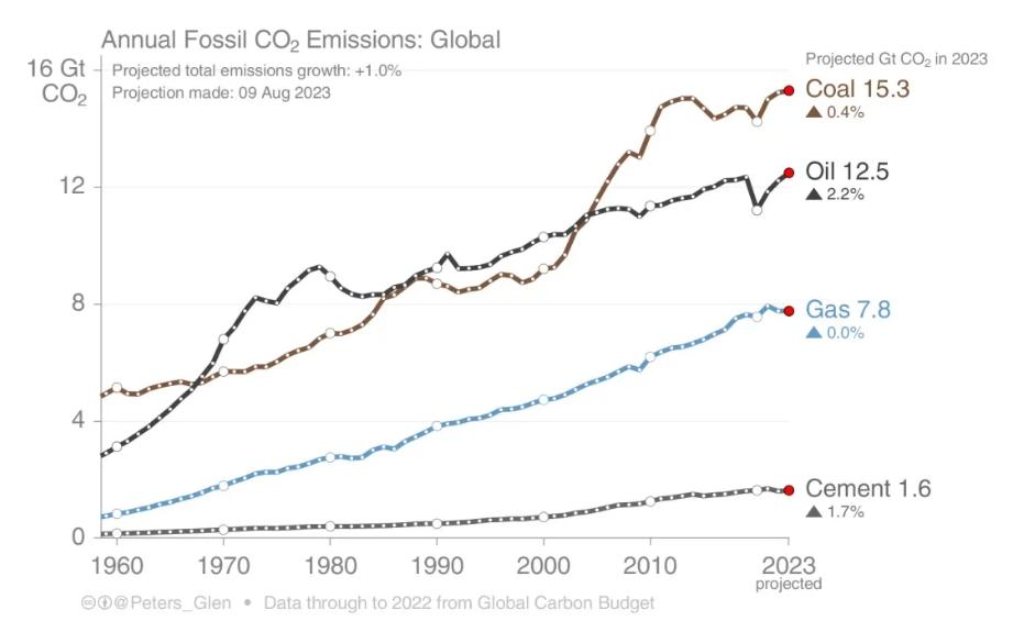 Bawden, Tom [2023], "Revealed: World’s CO2 emissions set to rise by about 1 per cent to new record in 2023", inews, 15 de octubre, https://inews.co.uk/news/environment/revealed-worlds-co2-emissions-set-r...