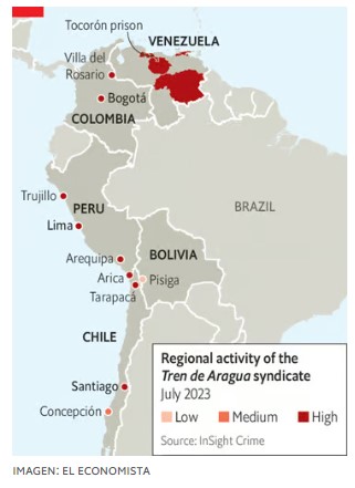 3) En la imagen 1 se puede apreciar la actividad regional en América Latina de la pandilla Tren de Aragua en el primer semestre del 2023 (enero-julio), donde tiene mayor presencia en Venezuela y las principales ciudades de Lima (Perú), Santiago (Chile) y Bogotá (Colombia).
