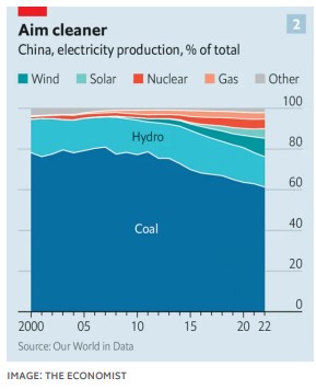 2) Las grandes inversiones de China en energías renovables han hecho posible que tengan la capacidad de 750 gigavatios (GW) de generación eólica y solar, lo que representa aproximadamente un tercio del total mundial. Para finales de la década de 2020 el gobierno pretende tener 1 200 GW de dicha capacidad, más que la capacidad eléctrica total de la Unión Europea (UE) actualmente. Así que, China probablemente superará ampliamente ese objetivo.