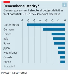 7) La gráfica 2 representa el déficit presupuestario estructural del gobierno general como % del Producto Interno Bruto (PIB) potencial, 2015-23 de disminución unitaria. En esta se puede apreciar que, a pesar de la alta inflación, los países pertenecientes a la Unión Europea tendrán un déficit fiscal promedio de aproximadamente 3% de su población PIB el presente año. Por otro lado, el déficit de Estados Unidos alcanzará 8.2%, según estimaciones del FMI