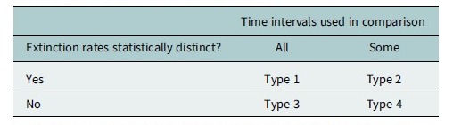 Se han establecido cuatro tipos de extinción (dato crucial 5) considerando dos factores para la determinación de estas etapas. El primero consiste en que los intervalos de tiempo tienen tasas de extinción diferentes a las tasas de extinción de otros intervalos de tiempo utilizados para los análisis. El segundo factor consiste en los subconjuntos de intervalos de tiempo que se utilizaron para el análisis.