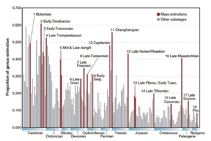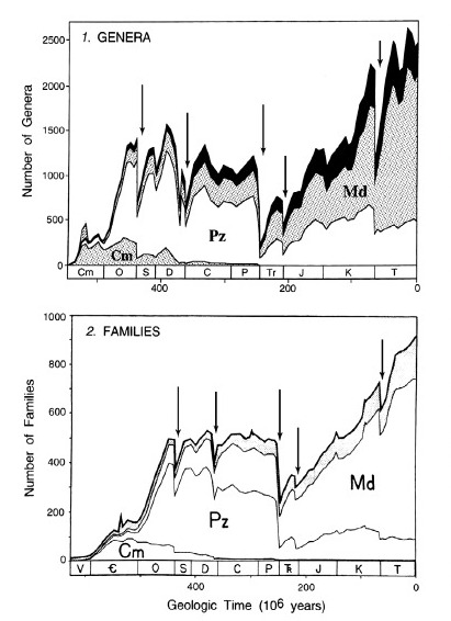 La figura 1 muestra las trayectorias de la diversidad por etapa de géneros marinos y por familias. Las flechas señalan las cinco extinciones masivas, es decir, los picos de mayor pérdida de biodiversidad.