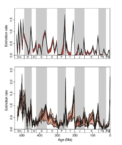 La figura 3 muestra los métodos que se utilizaron para compensar lo incompleto del registro fósil. La primera gráfica corresponde al primer análisis con el PBDB de 2008 y la segunda gráfica corresponde al método utilizado en el análisis de 2019. En comparación con la figura 2 en la que se representan las extinciones de acuerdo a Sepkoski, en la figura 3 se observan más picos de extinción a lo largo del tiempo geológico.