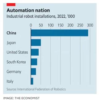 4) En el año 2022, 36% de los robots industriales que China instaló se fabricaron en el país, frente a 25% en instalado previamente en 2013. Shenzhen Inovance Technology, una gran empresa china, construye robots que se utilizan para fabricar luces led y teléfonos móviles y es posible que pueda obtener todos los componentes que necesita de empresas chinas dentro de cinco años, dice Zhu Xingming, el actual presidente de la empresa.