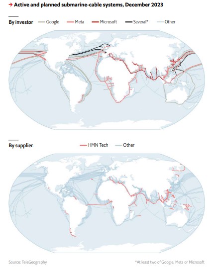 The Economist [2023], "4,000 terabits under the sea. Big tech and geopolitics are reshaping the internet's plumbing", The Economist, London, 23 de diciembre, https://www.economist.com/business/2023/12/20/big-tech-and-geopolitics-a...