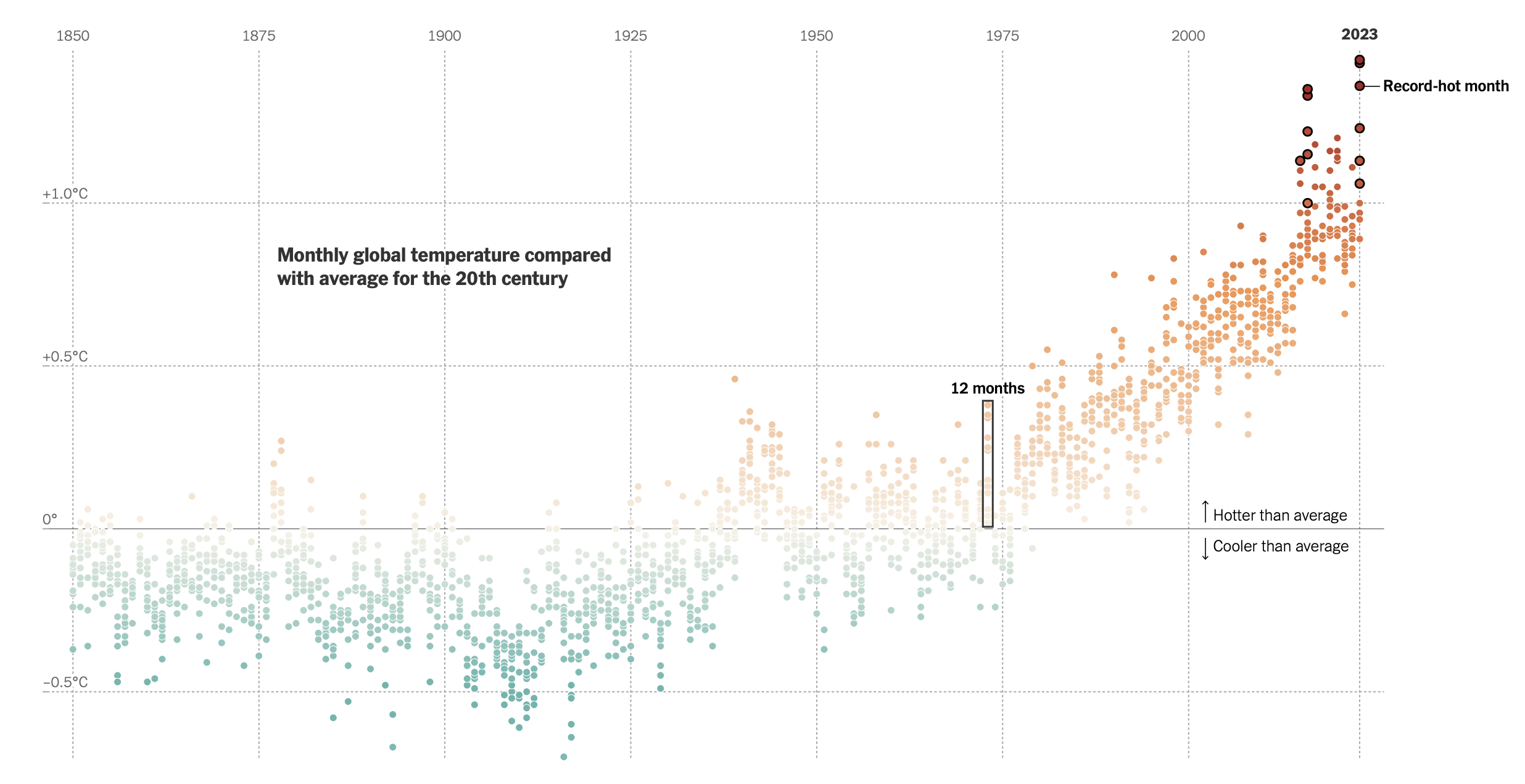 El 2023 ha sido el año más cálido en los últimos 125 000 años, ejemplo de ello fueron: las olas de calor en Phoenix y Argentina, incendios forestales en Canadá, inundaciones mortales en Libia, y el bajo hielo sin precedentes de los mares cerca de la Antártida. Durante la segunda parte del año, se registraron temperaturas globales anormales, mercurio subiendo puntos mensualmente, y la primavera presente durante diciembre en el noroeste de Estados Unidos.