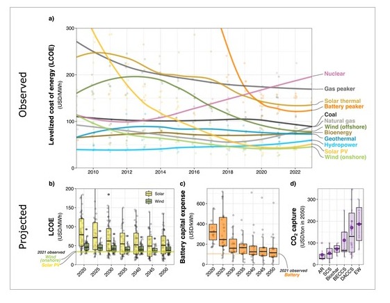 2. En la figura 1 se presenta una serie de gráficas. En a) se observa el costo nivelado de energía (LCOE, por su sigla en inglés) en el periodo de 2009-2023, en esto se incluyen costos por fabricación, instalación, operación y desmantelamiento por unidad de energía producida. En b) se observa el LCOE proyectado para la producción de energía solar fotovoltaica y eólica terrestre. En c) se presenta el gasto de capital proyectado de celdas de baterías de iones de litio. Por último, en d) se observa el costo de recaptura de CO2 proyectado en 2050 para forestación (AR, por su sigla en inglés), secuestro de carbono en el suelo (SCS, por su siglo en inglés), enmiendas de suelo con biocarbón, captura y almacenamiento de carbono para bioenergía (BECCS, por su sigla en inglés) y la captura y almacenamiento directo de carbono en el aire (DACCS, por su sigla en inglés).