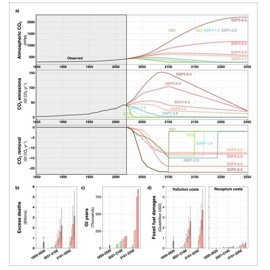 3. En la figura 2 se plantean diferentes escenarios climáticos para evaluar el comportamiento futuro con la implementación de energías limpias y emisiones negativas. En a) se presenta la presión parcial de CO2 atmosférico observada y proyectada, emisiones brutas y eliminación de CO2 para los escenarios propuestos. En b) se presenta en exceso de muertes asociadas por la contaminación del aire de combustibles fósiles. En c) se encuentran las gigatoneladas por años de CO2 en la atmósfera que están por encima de los niveles preindustriales. Y en d) están los daños económicos derivados del uso de combustibles fósiles, estos daños toman en cuenta los costos de contaminación y costos de recaptura.