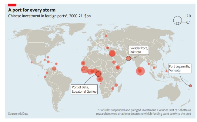 5) El mapa 2 muestra la inversión china en puertos extranjeros en el periodo de 2000-2021. En este se puede notar que existe una gran presencia en África en Guinea Ecuatorial y en el puerto de Gwadar, Pakistán.