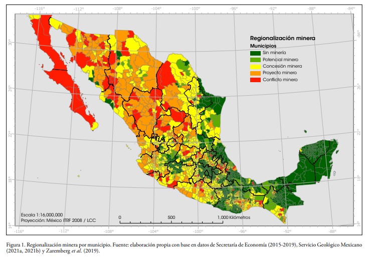 8) El mapa 1, la regionalización minera en municipios clasificados por: sin minería, potencial minero, concesión minera, proyecto minero y conflicto minero en el periodo 2015-2019. Se puede observar que la mayor parte concentrada con de la minería está en el norte de México, ya sea que existan concesiones mineras, proyectos mineros o conflictos. En sentido contrario, el sur del país presenta casi en su totalidad la ausencia de actividades mineras.