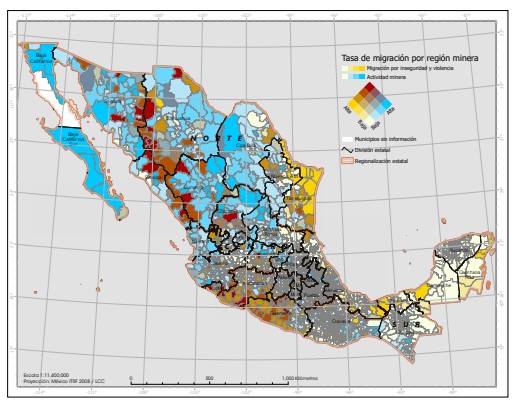 La Región Norte del país, Chihuahua, Sinaloa y Tamaulipas destacan por su alta tasa de emigración, especialmente en zonas con conflictos mineros. Aunque Tamaulipas también presenta tasas de migración significativas en territorios con intervención minera de distintos tipos, lo que sugiere que este fenómeno no necesariamente se debe a la minería en sí. Mientras que, la Región Sur se destaca la alta tasa de emigración provocada por la violencia, especialmente en zonas con actividades mineras como Michoacán y Guerrero. Además, en estos estados también se observan tasas significativamente altas en municipios con diferentes tipos de actividad minera.