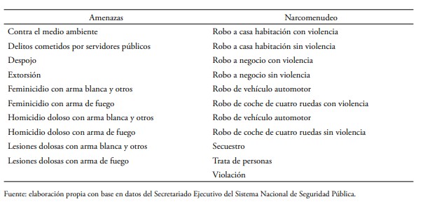 9) La tabla 1 representa los delitos considerados de alto impacto, en ella se puede ver de un lado las amenazas y las actividades de narcomenudeo.