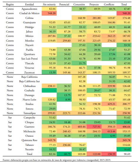 10) La tabla 2 muestra la tasa de migrantes por violencia e inseguridad por 100 000 habitantes por región minera. En ella se puede observar que la Ciudad de México y Quintana Roo no tienen actividades mineras, pero tiene una alta migración, lo que demuestra una contradicción en las variables estudiadas en el presente trabajo. Por otro lado, está el de Guerrero que tiene altos niveles de concesión y proyectos mineros causando una mayor cantidad de migrantes, al igual que el estado de Michoacán, representadas por color rojo.