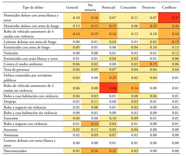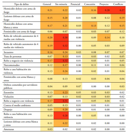 13) La tabla 3, muestra los coeficientes de determinación de Spearman por tipo de delito y actividad minera en la Región Norte de México. En ella, se puede observar que el homicidio doloso con arma blanca y otros, robo de vehículo automotor de 4 ruedas sin violencia, robo a negocio con violencia y homicidio doloso con arma de fuego son los que tienen índices más altos. Sentido contrario al de robo casa habitación sin violencia, lesiones dolosas con arma blanca y otros.
