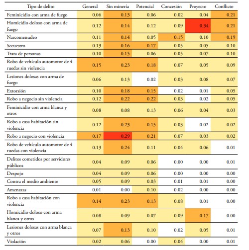 14) La tabla 4, muestra Coeficientes de determinación de Spearman para la Región Centro de México, por tipo de delito y actividad minera. Se puede apreciar que pese a tener diversos delitos con importantes índices como feminicidios con arma de fuego, robo de vehículo automotor de 4 ruedas sin violencia y extorsión, existen dos en específico que se proyectan en niveles altos como el homicidio doloso con arma de fuego y robo a negocio con violencia.