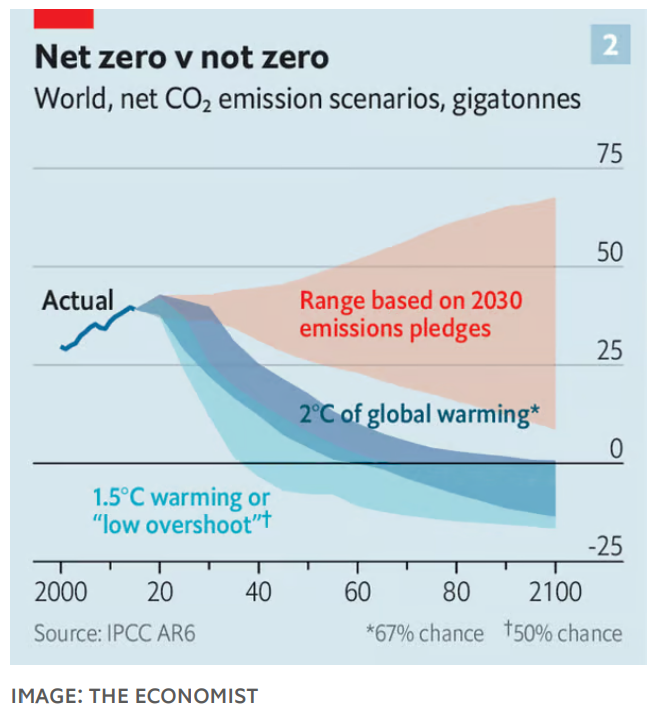 4. A pesar de los esfuerzos de reducción de gases de efecto invernadero, las proyecciones de la ONU indican que el calentamiento global podría alcanzar entre 2.5°C y 2.9°C para finales de siglo, siendo necesario un recorte adicional de 28% en emisiones para mantener las temperaturas por debajo de los 2°C. En la Gráfica 2 se puede observar los escenarios de emisión neta de CO2 de la actualidad hacia el 2100.