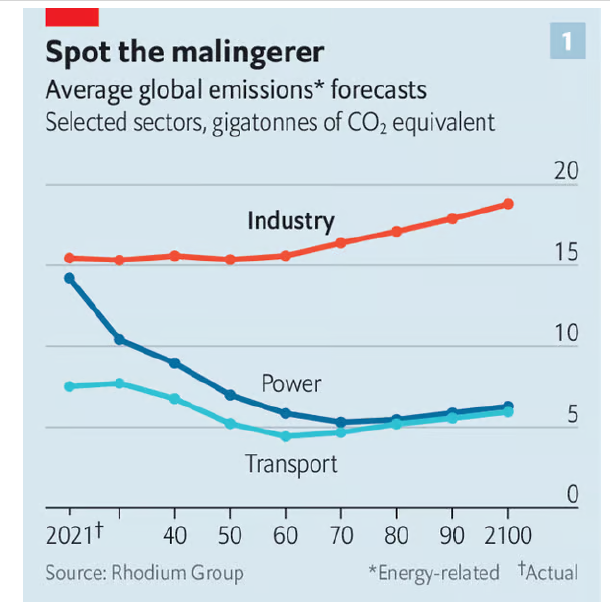 3) La gráfica 1 Spot the malingerer muestra un pronóstico del promedio global de emisiones para los rubros industria, poder y transporte, en un periodo que va de 2021 hasta 2100. En tal sentido, se constata que incluso con la reducción de las emisiones de electricidad y transporte, la industria seguirá generando emisiones muy por encima de los antes mencionados.
