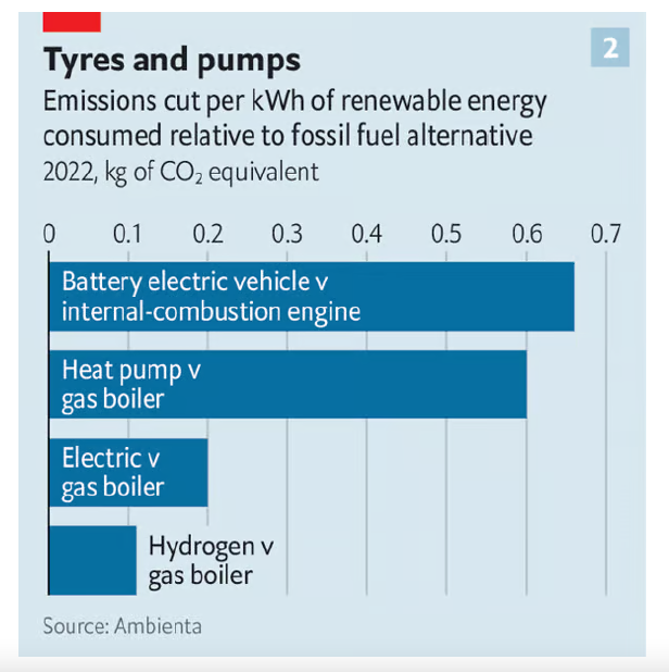 7) La gráfica 2 Tyres and pumps muestra la reducción de emisiones por kilowatt-hora de energía renovable consumida en relación con los combustibles alternativos en el año 2022. Las tecnologías analizadas fueron una batería de un vehículo eléctrico frente al motor de combustión interna, una bomba de calor versus una caldera de gas, electricidad directa frente a una caldera de gas, y finalmente, hidrógeno verde contra una caldera de gas. Sobre el particular, es claro que las tecnologías que utilizan electricidad para producir energía fueron superiores al hidrógeno verde. Además, las baterías eléctricas y la bomba de calor supusieron la mayor reducción de emisiones frente a los combustibles fósiles.