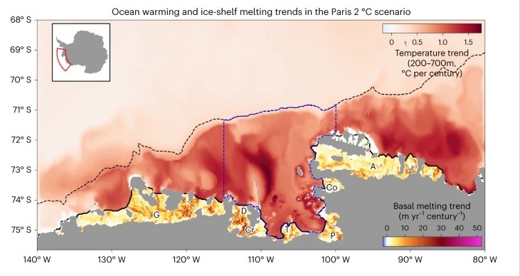 1. En la figura 1 se observa un mapa de tendencias medias del conjunto de la temperatura del océano y el derretimiento basal de la plataforma de hielo en el escenario de París 2°C.