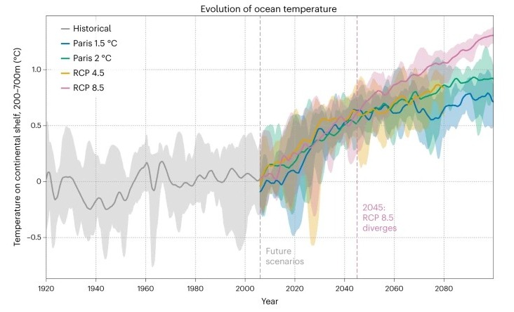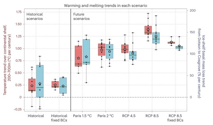 De igual manera se encontró que las tendencias futuras de calentamiento pueden variar dependiendo de las fases de variabilidad climática interna. Las tendencias de París 1.5°C, París 2°C y RCP 4.5 son estadísticamente indistinguibles para el derretimiento y el calentamiento. El escenario de RCP 8.5°C se puede distinguir de los demás escenarios planteados, esto indica que la mitigación del clima tiene un papel limitado en la prevención del calentamiento de los océanos, mientras que la variabilidad climática interna tiene una mayor incertidumbre que las emisiones futuras de gases de efecto invernadero.