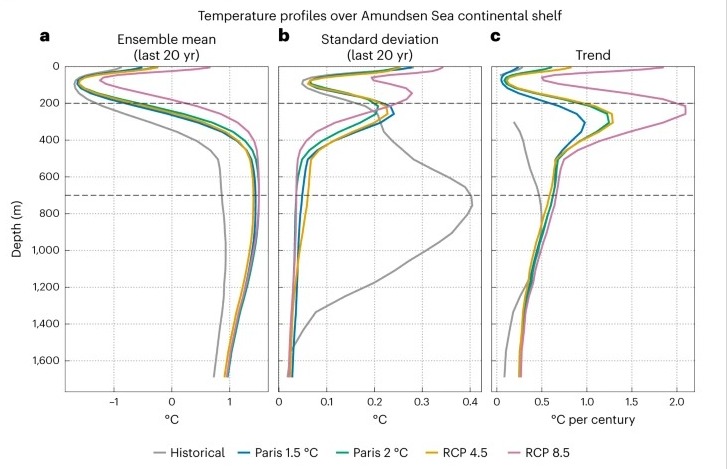 Los cuatro escenarios futuros muestran un aumento de la termoclina y una tendencia de calentamiento que se concentra a media profundidad, es decir, hay un mayor volumen de CDW cálido. En los escenarios de menor forzamiento la desviación estándar se mantiene en el rango de profundidad, lo que indica que a pesar de que los periodos fríos son menos comunes, sigue presentándose una variabilidad en la temperatura media. En el escenario de RCP 8.5 la termoclina aumenta al grado en el que las cavidades tienen agua cálida. En el escenario histórico una de las causas del calentamiento fue la desaparición de los eventos convectivos fríos en la plataforma continental. Este fenómeno solo influyó en el escenario histórico, debido a que este se detuvo a principios del siglo XXI.