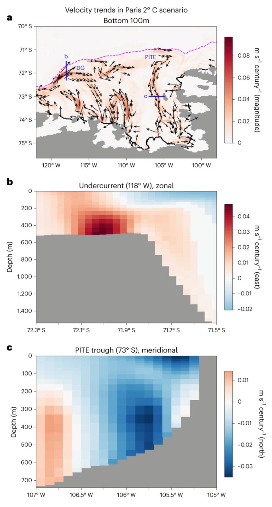 La circulación intensificada sobre la plataforma y el talud continental provoca un aumento de la termoclina, que lleva un mayor volumen de CDW a la costa. La corriente subterránea de Amundsen, que se fortalece en las simulaciones, gira sobre la costa y transporta CDW hacia el sur por medio de canales batimétricos, el transporte también se fortalece en Pine Island Thwaites East Trough (PITE) (dato crucial 5). El aumento del flujo de CDW provoca que la plataforma continental y las cavidades de las plataformas de hielo adyacentes se calienten. También las tendencias individuales en la temperatura de la plataforma continental se correlacionan con las tendencias en el transporte hacia el sur. Con esto, es posible decir que la intensificación de las corrientes subterráneas es el principal impulsor del calentamiento en el mar de Amundsen y del derretimiento de las plataformas de hielo.