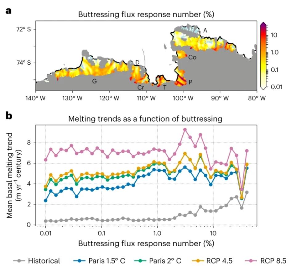 6. En la figura 6 se presentan las implicaciones del derretimiento simulado para el refuerzo de las plataformas de hielo. En a se encuentra el efecto del adelgazamiento de la plataforma de hielo local sobre el aumento del nivel mar y en b están las tendencias medias de fusión basal de la plataforma de hielo en conjunto como función de BFRN.
