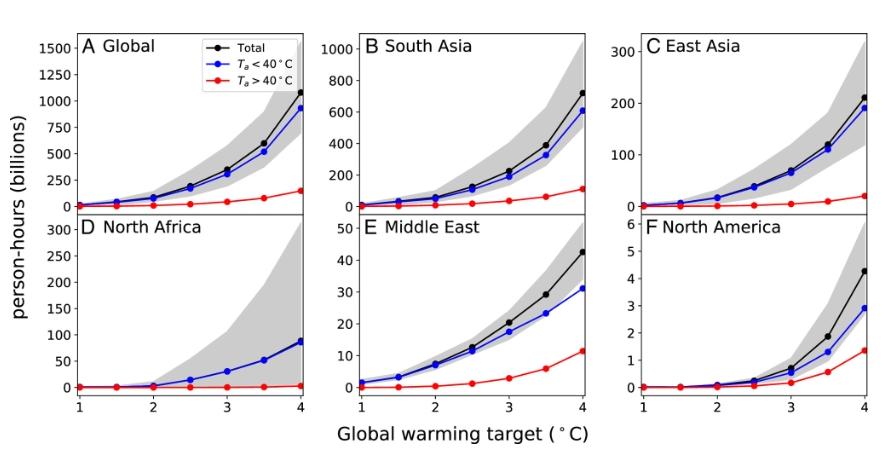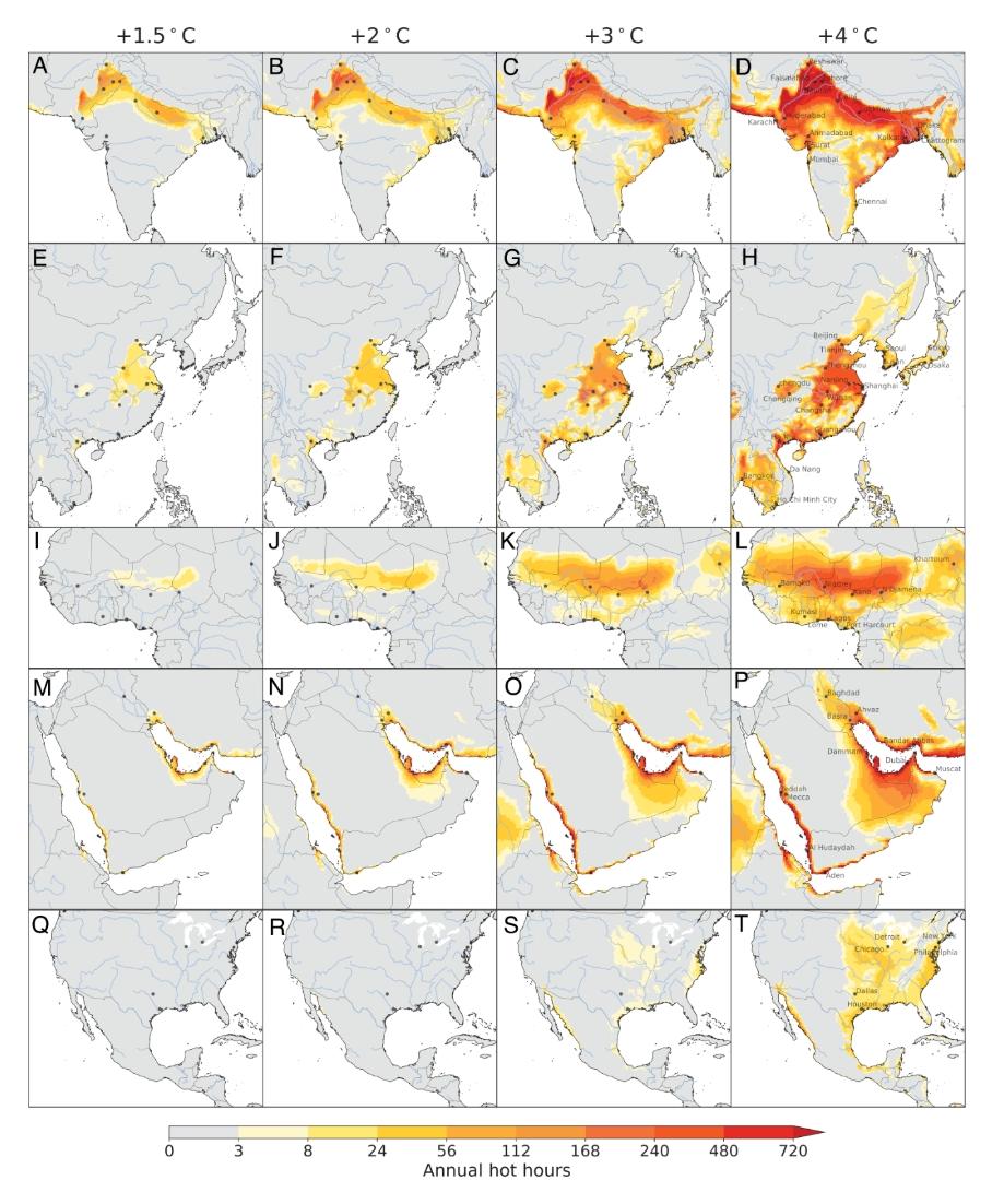 Para los escenarios con un calentamiento de 2°C o menos, las condiciones que se asocian con la superación del umbral, están limitados al valle del río Indo (en el este de China), la costa del Golfo Pérsico y África subsahariana. Las regiones mencionadas se encuentran doblemente expuestas al calor extremo debido a la alta radiación y a la proximidad de cuerpos de agua con temperaturas superficiales altas. Con un aumento de 3 y 4°C en la GMST se tiene un mayor estrés por calor húmedo y las regiones mencionadas tienen aumentos significativos en el número de horas anuales por encima de los umbrales de estrés por calor. El área afectada no se limita a las regiones de China, India y África, ya que algunas regiones de América del Norte y del Sur presentan una acumulación de horas calurosas. Cuando la GMST llega a 4°C, el norte y centro de Australia comienza con la acumulación de horas por encima del umbral.