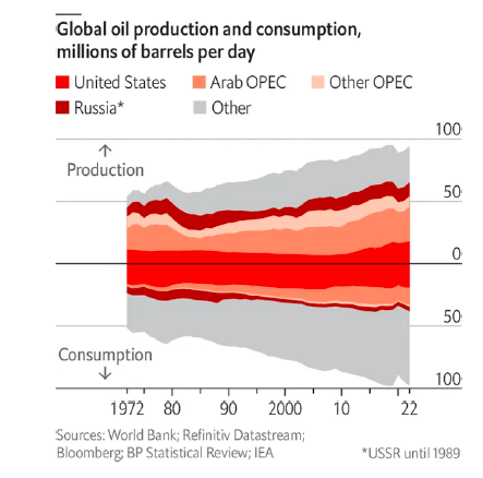 The Economist [2024], "The long goodbye. For 50 years the story of oil has been one of matching supply with increasing demand", The Economist, London, 16 de marzo, https://www.economist.com/special-report/2024/03/11/for-50-years-the-sto...