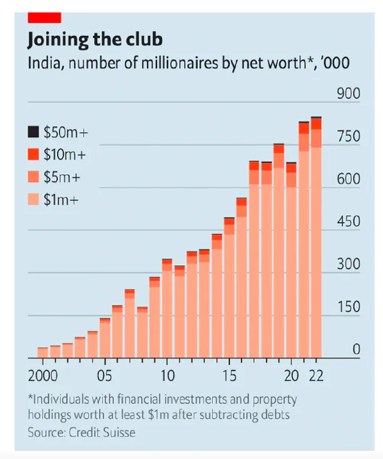 3) De acuerdo con el banco suizo, Credit Suisse, India poseía 850 000 millonarios en dólares en 2022. Esto supone un aumento neto respecto de 473 000 de hace una década. En este sentido, entre 2012 y 2022, el número de millonarios en dólares creció a un ritmo anual de 8.5%, por encima del crecimiento del Producto Interno Bruto (PIB) de 5.6%. Así, los gestores de patrimonio esperan que el número de millonarios se incremente a una tasa de 15-20% anual.