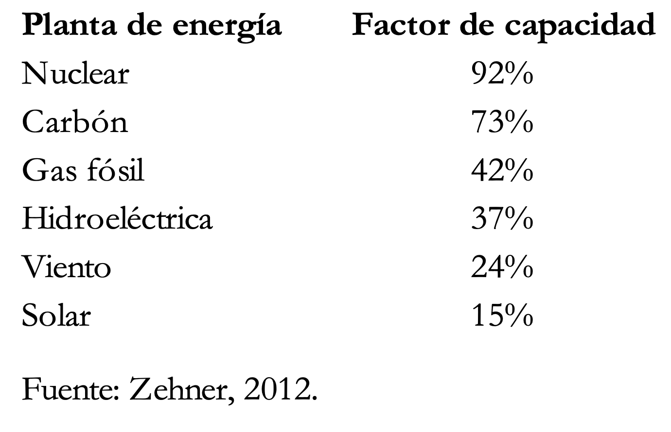 Fabre (2019) realizó una proyección de la tre de diferentes tecnologías para 2030 y 2050, en la que comparó energías renovables con energías fósiles (Tabla 1), mostró que la tre de las energías renovables es y será considerablemente más baja que la de las fósiles. Un segundo dato es el factor de capacidad (Tabla 2), que expresa la diferencia entre la capacidad máxima de una planta de energía y la producción real de esa planta a lo largo del tiempo. Como se puede ver, el factor de capacidad de las renovables también es significativamente más bajo que para las fósiles. Estos datos revelan que las energías renovables no son tan eficientes como las fósiles.