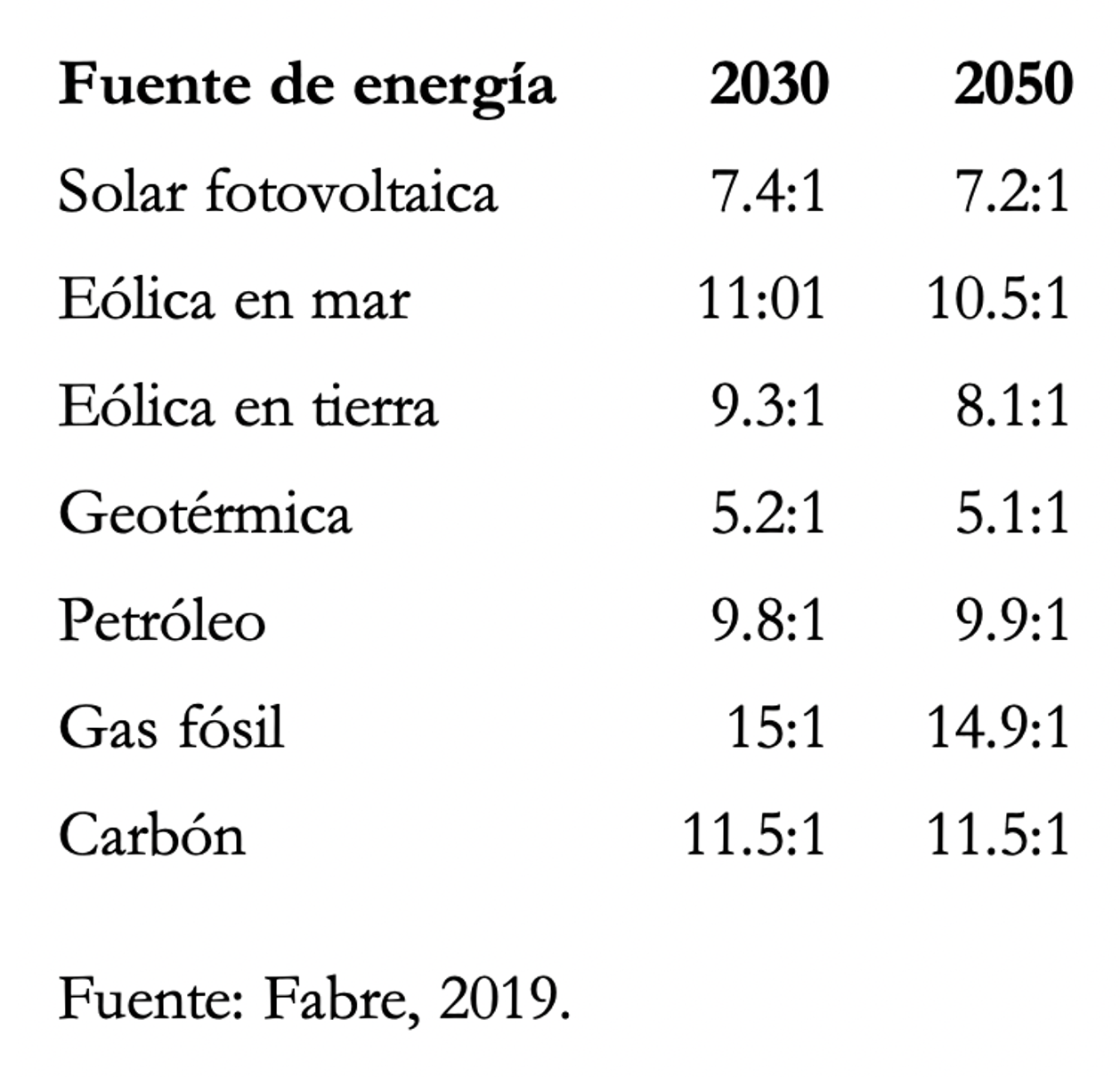 Tabla 1. Tasa de Retorno Energético de energías renovables y fósiles