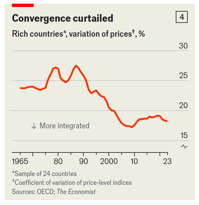 16) La gráfica 4 presenta la variación de los precios para una muestra de 24 países ricos en el periodo 1965-2023. En tal sentido, la caída de la paridad de precios se hace más evidente desde la década de 2000.