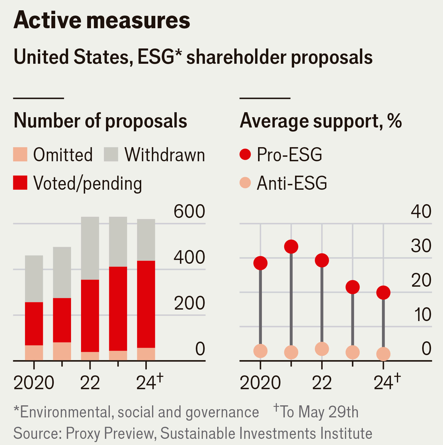 3) Los gráficos muestran el número creciente "declaraciones de representación" ESG desde 2020 a 2024, frente a la disminución en su aceptación en Estados unidos.