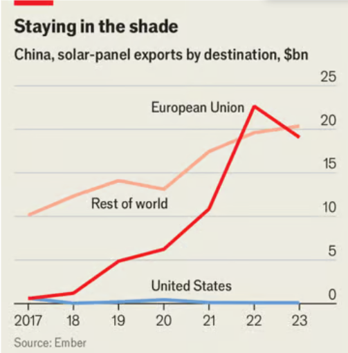 6) Gráfico Staying in the shade (permaneciendo en la sombra). Muestra los destinos de exportación de los paneles solares de China desde 2017 a 2023, por valor (miles de millones).