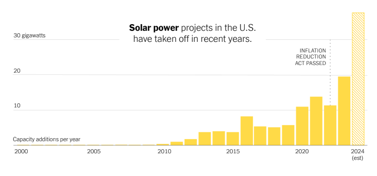 La Ley de Reducción de la Inflación de 2022, firmada por el presidente Biden de Estados Unidos, buscaba impulsar la energía renovable con exenciones fiscales, haciendo la energía solar y eólica más baratas que los combustibles fósiles. Hasta ahora, la energía solar ha alcanzado niveles récord en Estados Unidos, al igual que las baterías para almacenamiento de energía. Sin embargo, la energía eólica ha enfrentado dificultades tanto en tierra como en el mar, con una capacidad de crecimiento menor que antes de la ley.