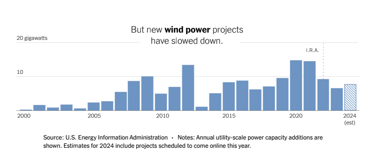 Los problemas incluyen cadenas de suministro estancadas, falta de líneas de transmisión, un proceso largo de obtención de permisos y la oposición de las comunidades a nuevos proyectos. Si la energía eólica sigue estancada, será más difícil combatir el calentamiento global, ya que se necesita una expansión tanto de la energía solar como de la eólica, que se complementan al generar electricidad en diferentes momentos del día. Las expectativas iniciales de que la ley ayudaría a reducir las emisiones de gases de efecto invernadero en un 40% para 2030 ahora son menos seguras.