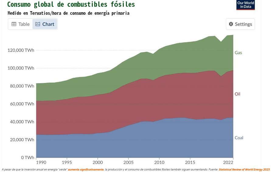 2) Considerando la economía capitalista, la producción debe aumentar a fin de mantener y aumentar los beneficios. Lo anterior dio como resultado que en 2023 aumentaron los proyectos en cuanto a combustibles fósiles.
