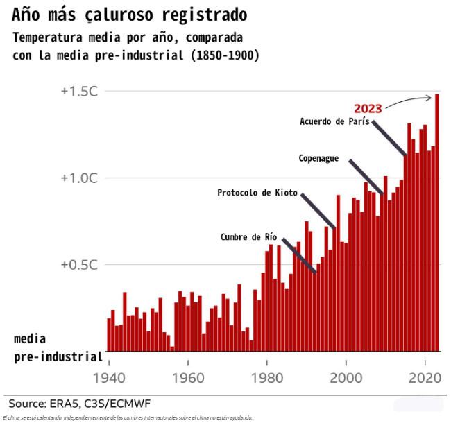 1) En la figura 1 se disponen de los datos año contra año de las temperaturas. Además, se resalta la ineficacia de los acuerdos en los que pretende solucionar el cambio climático.