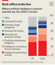7) El gráfico 2 muestra una comparativa del porcentaje de contratos militares sobre Inteligencia Artificial adjudicados por Estados Unidos y China entre abril a noviembre del 2020.
