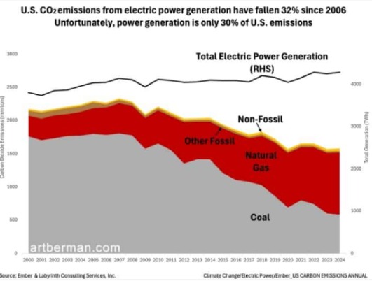 Los defensores de las energías renovables a menudo presentan información selectiva para crear la impresión de que la transición energética está avanzando rápidamente (dato crucial 1), donde se muestra una disminución de 32% en las emisiones de CO2 en Estados Unidos desde 2006, pero la generación de electricidad solo representa 30% de las emisiones de Estados Unidos. Además, una parte significativa de la reducción de emisiones en Estados Unidos se debe al cambio del carbón al gas natural, con la energía eólica y solar contribuyendo en menor medida (la eólica representó aproximadamente 19% de la reducción, mientras que la solar sólo 4%).